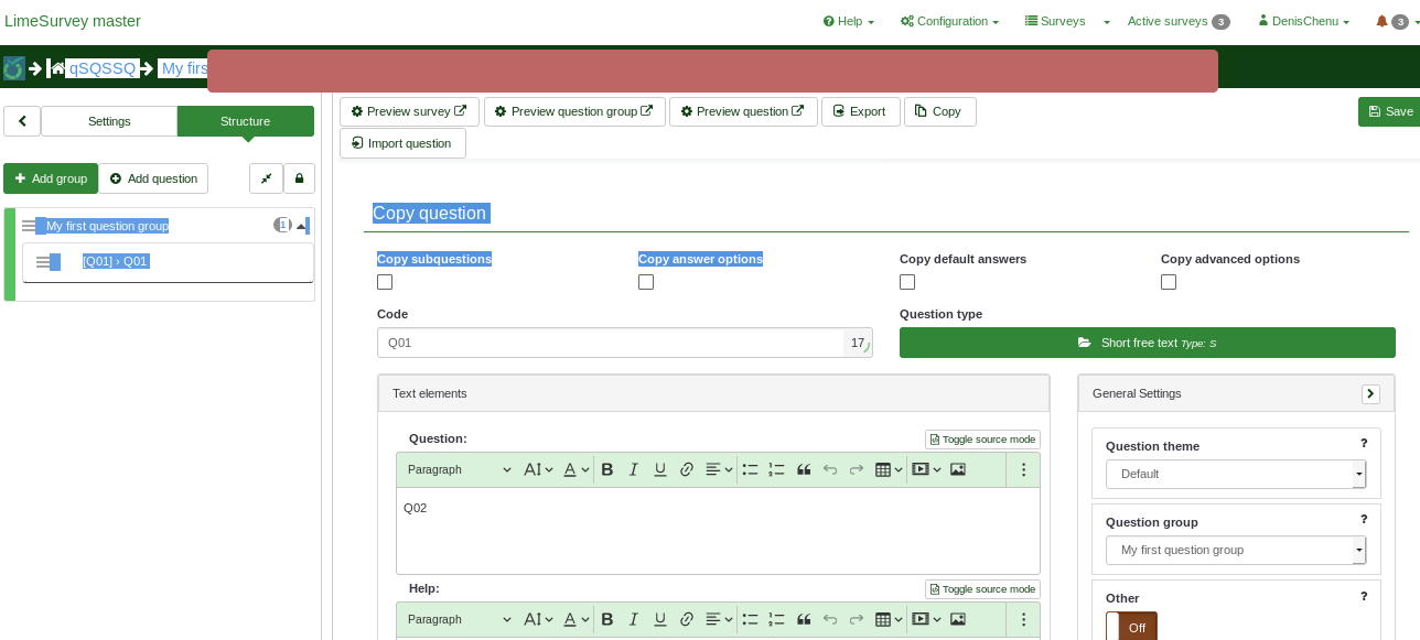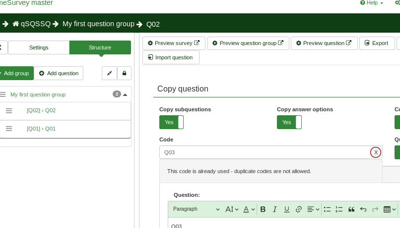 | Steps To Reproduce | Create a survey, set code to Q01 | ||||