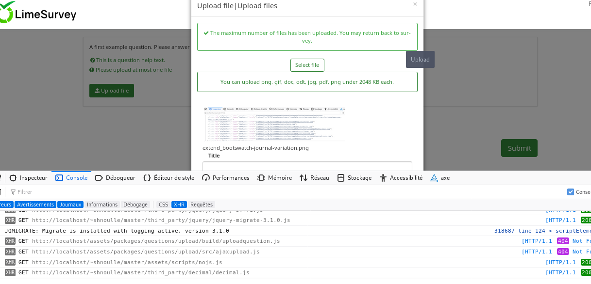| Steps To Reproduce | Import included survey, acctivate debug at 2, launch survey, activate console, move next : check console. Maybe need to be inside a subdirectory ? | ||||