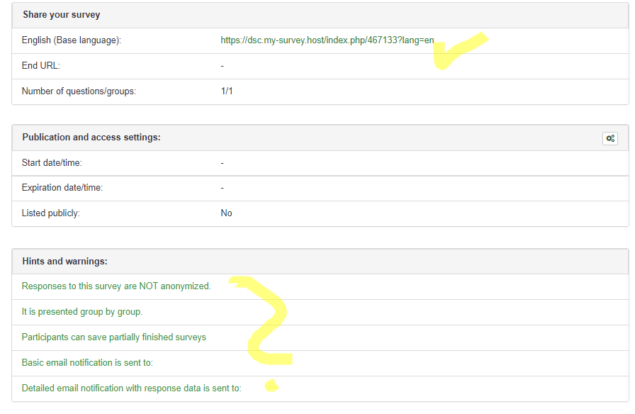 | Description | When selecting a survey at LS4 and being presented with the overview of all survey settings, the "Hints and warnings:" section bottom left shows texts with green color which is misleading. We are using that green color for linked texts only. The texts shown there, that is just generic information and should use default font color (#35363f?). | ||||
