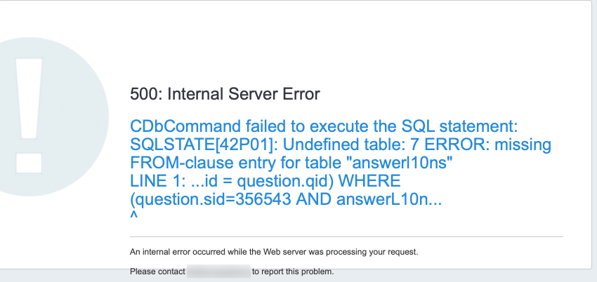 | Additional Information | Enabling debug=2 and debugsql=1, the attached report was obtained (CDbException.html) The SQL statement that appears to be causing the issue is: SELECT "t"."aid" AS "t0_c0", "t"."qid" AS "t0_c1", "t"."code" AS "t0_c2", "t"."sortorder" AS "t0_c3", "t"."assessment_value" AS "t0_c4", "t"."scale_id" AS "t0_c5", "answerL10ns"."id" AS "t1_c0", "answerL10ns"."aid" AS "t1_c1", "answerL10ns"."answer" AS "t1_c2", "answerL10ns"."language" AS "t1_c3", "question"."qid" AS "t2_c0", "question"."parent_qid" AS "t2_c1", "question"."sid" AS "t2_c2", "question"."gid" AS "t2_c3", "question"."type" AS "t2_c4", "question"."title" AS "t2_c5", "question"."preg" AS "t2_c6", "question"."other" AS "t2_c7", "question"."mandatory" AS "t2_c8", "question"."question_order" AS "t2_c9", "question"."scale_id" AS "t2_c10", "question"."same_default" AS "t2_c11", "question"."relevance" AS "t2_c12", "question"."modulename" AS "t2_c13", "question"."encrypted" AS "t2_c14" FROM "answers" "t" LEFT OUTER JOIN "answer_l10ns" "answerL10ns" ON ("answerL10ns"."aid"="t"."aid") LEFT OUTER JOIN "questions" "question" ON (t.qid = question.qid) WHERE (question.sid=534913 AND answerL10ns.language = 'en') ORDER BY question.question_order, t.scale_id, sortorder | ||||