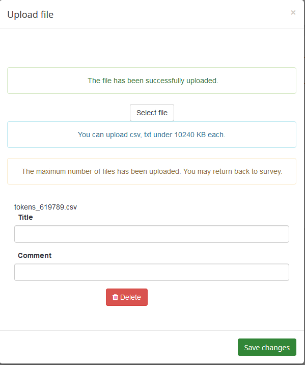 | Description | When you define a "file upload" question allowing only csv file (upload1.png), the selection of a csv file returns an error (upload2.png). | ||||