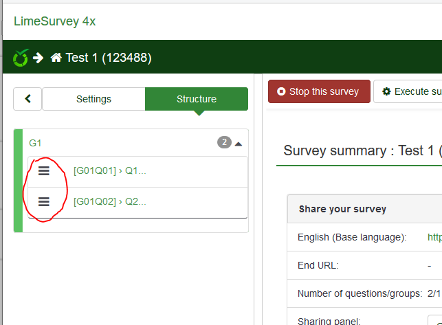 | Description | The reorder structure icons (see screenshot) are left visible in an activated survey. Since they can do nothing and actually cause a loop in the AJAX loading of that panel when an attempt to move them is made, they should not be visible in activated surveys. | ||||