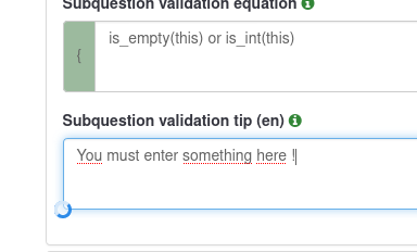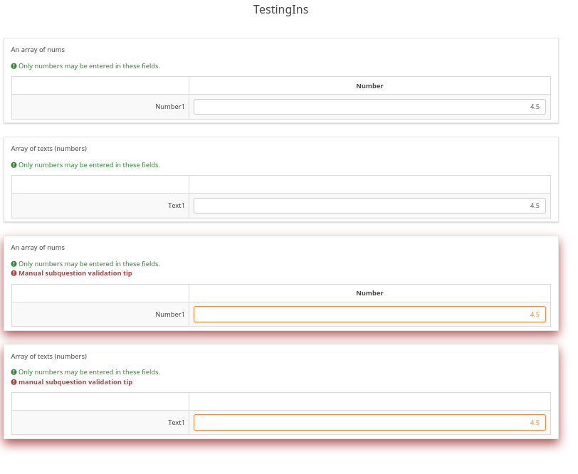 | Description | I create an array where for the user to input numbers but. I have tried to enforce the array to have only integer values. In the array I have enabled "only numbers" and in the subquestion validation I have added the following formula | ||||