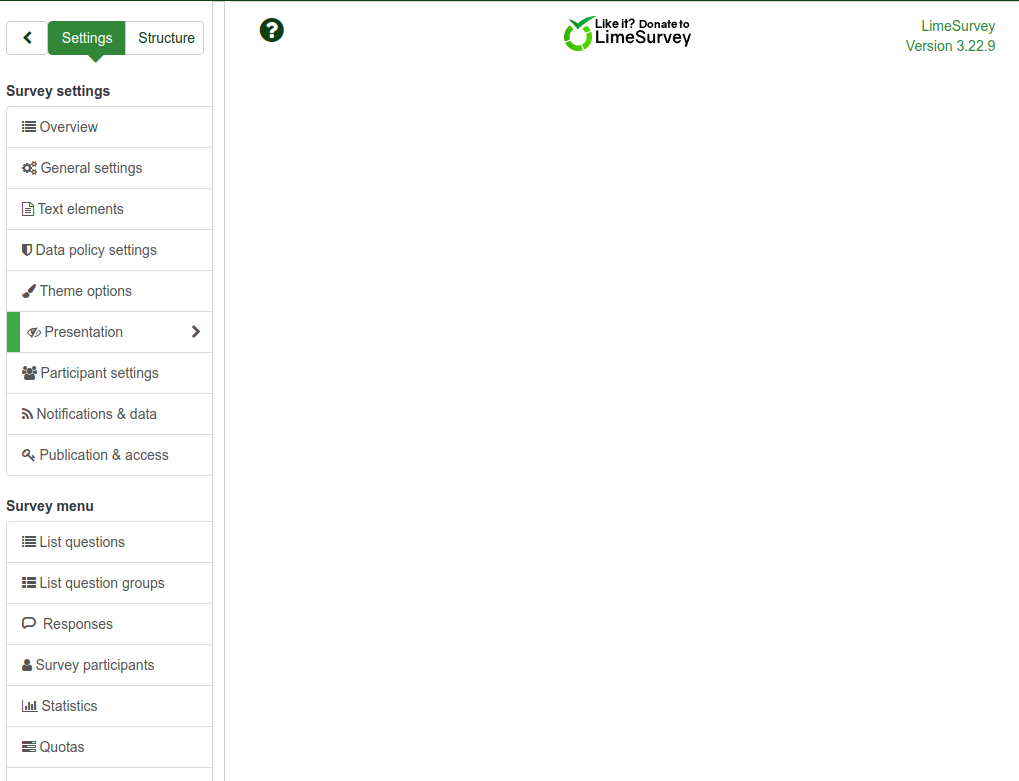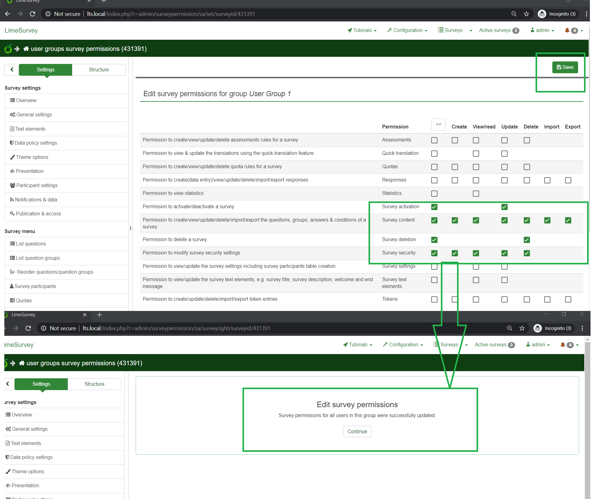 You need to "exit" the survey (go to survey list), and access again the survey you were working on to be able to visualize the survey settings options. P.s., Local/Survey Permissions are stored correctly. | ||||