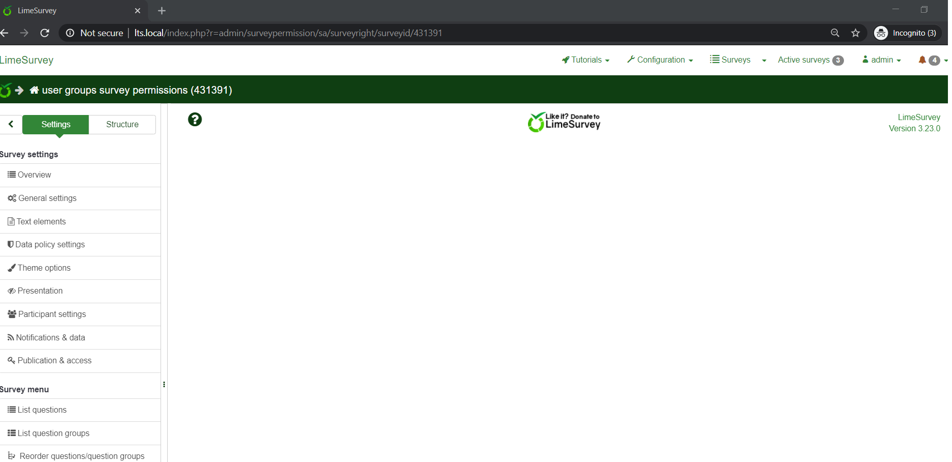 | Summary | 15989: Blank page after granting user groups survey permissions. | ||||