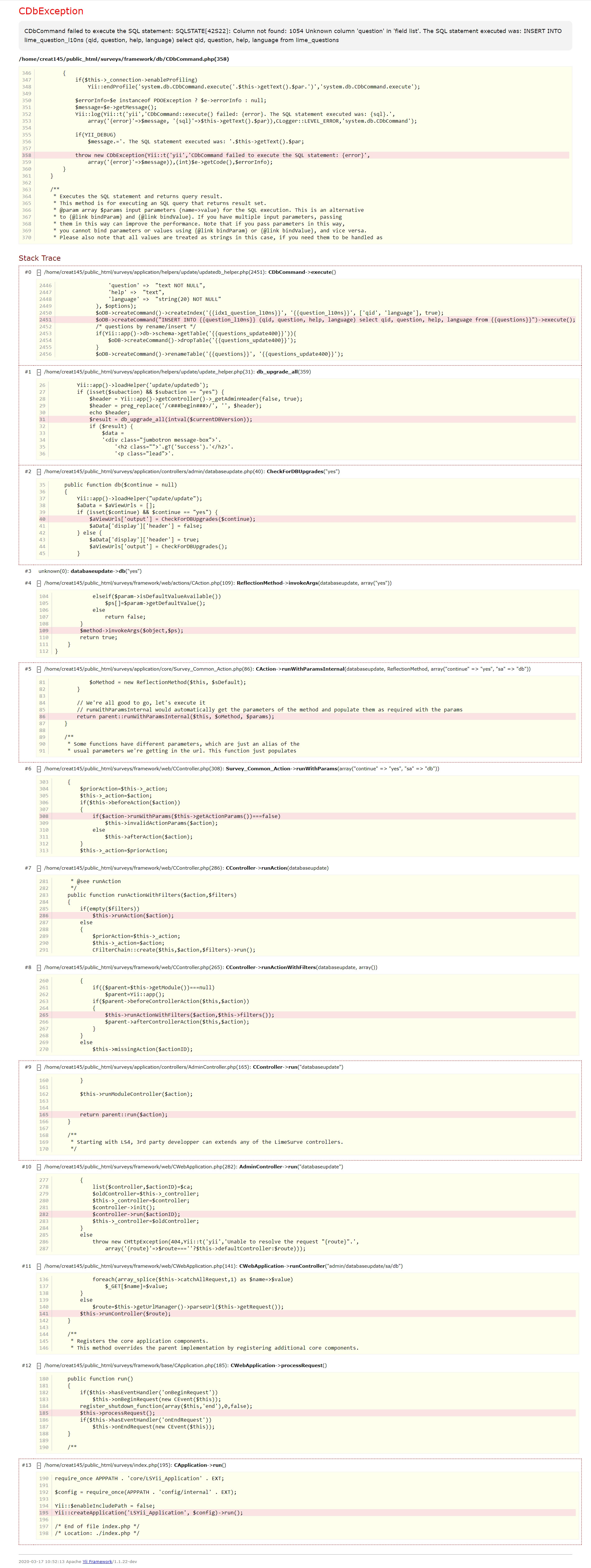 – /home/creat145/public_html/surveys/application/helpers/update/updatedb_helper.php(2451): CDbCommand->execute()