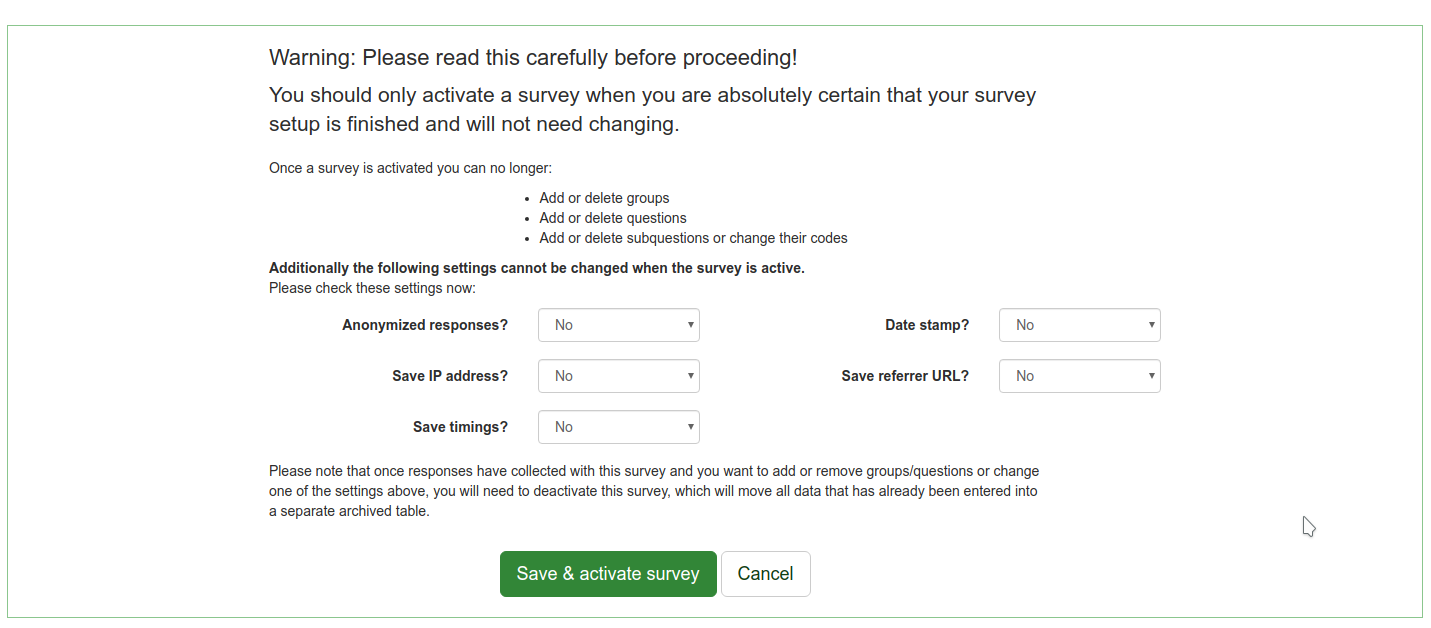 | Description | The options from the window that appears before activating a survey do not inherit the values set up at the group and global level |
