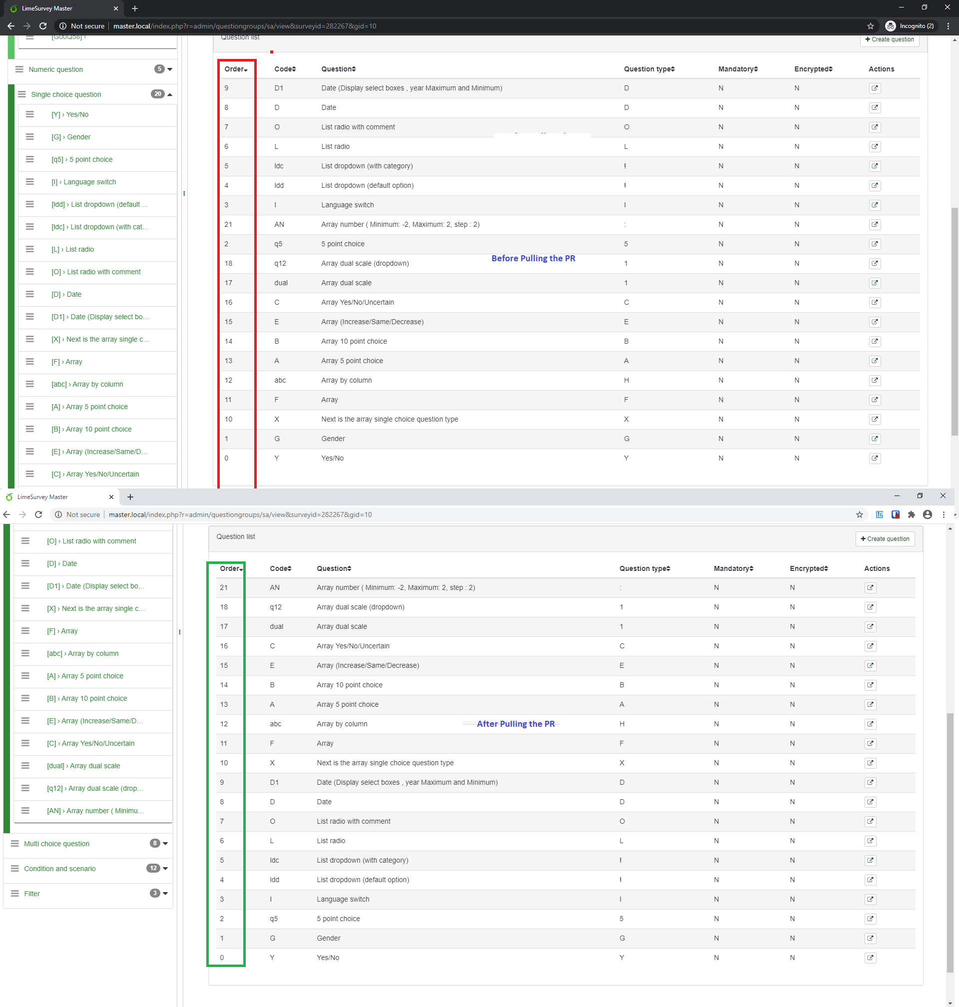 | Steps To Reproduce | Create a question group, add some questions -> The order might not be ok. | ||||