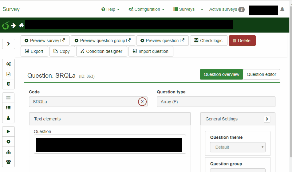 | Description | Hi An array question (type F, I think other as well) can not be edited, once it was saved. See attached image. | ||||