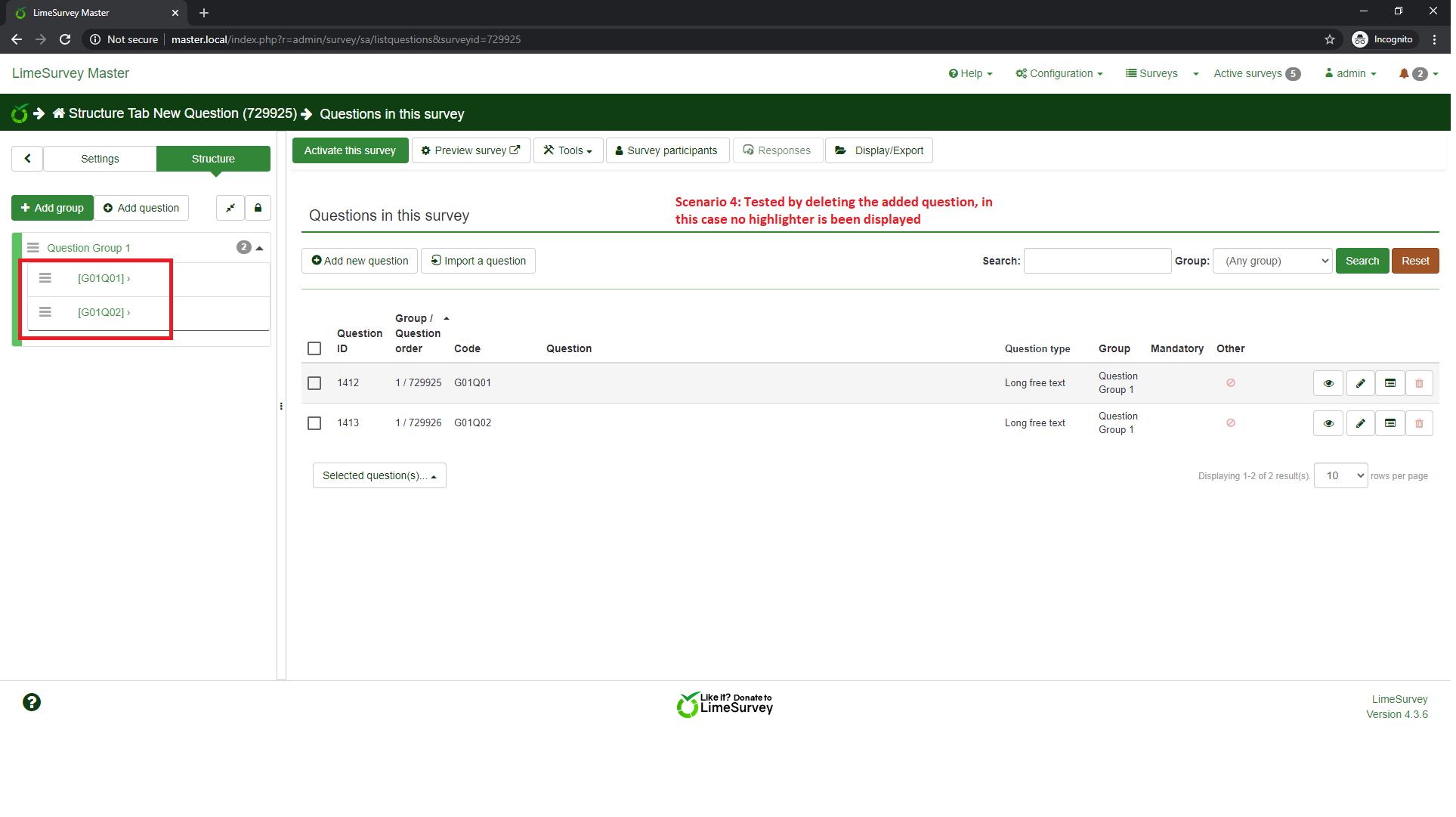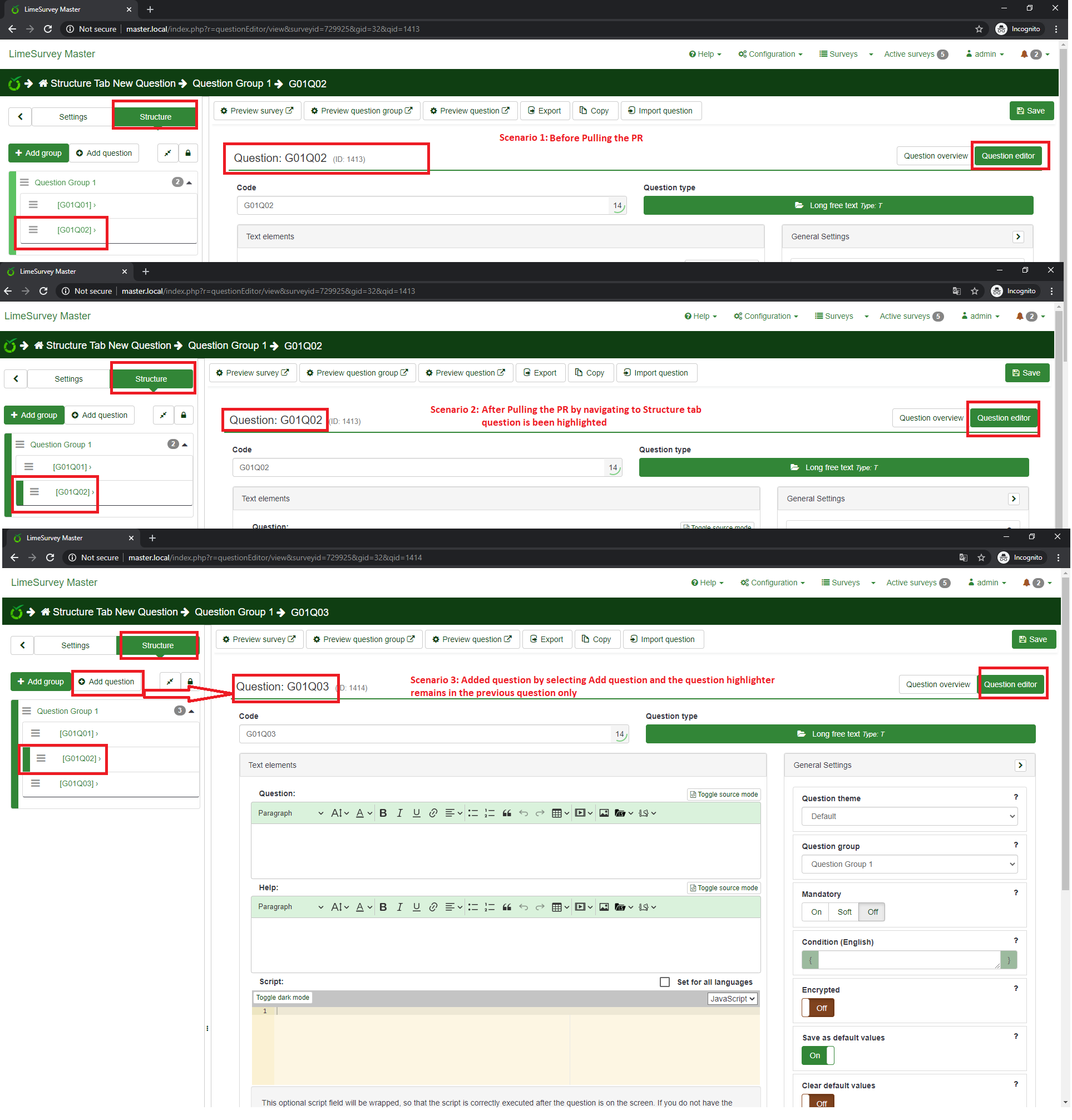 | Summary | 16081: Click on "Add question" located under Structure tab - view does not move to the newly created question. | ||||