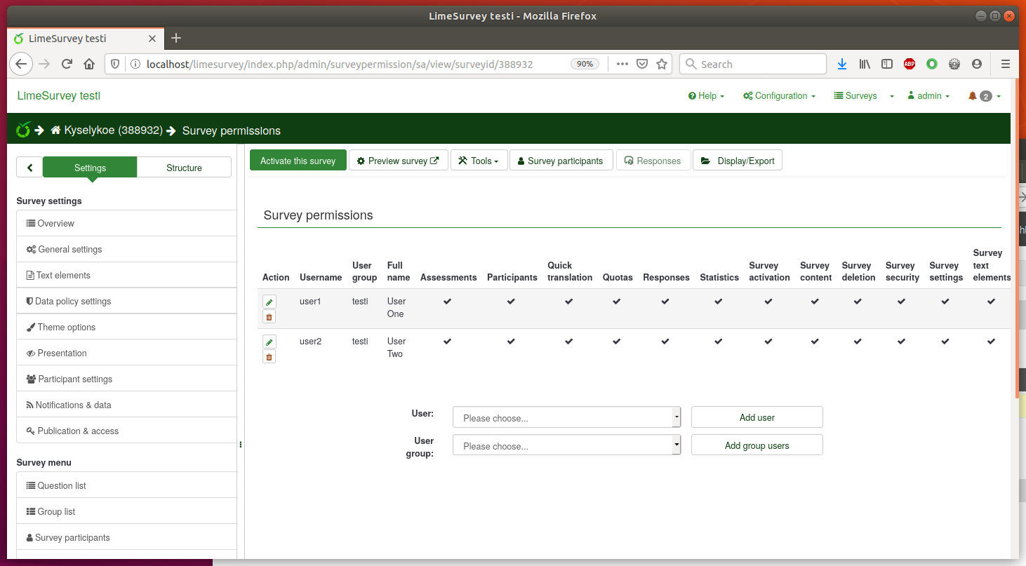 | Description | I installed version 4.1.15+200402, created users "user1" and "user2", and from global settings set "Group member can only see own group:" to off. Then I logged in as user1, made a survey and give user2 all permissions. Now user2 can modify survey text elements like the description, but can not modify questions nor question groups. Save-button is not even visible. | ||||