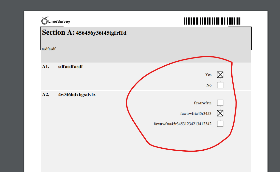 | Description | I tried printing a queXML PDF to store and scan in the future. Problem is: all box-type answers are cut after the first option - even normal Y/N questions, so I doubt it's a problem with custom answers Tried changing theme, language, keeping the default question group, nothing worked. At all. | ||||