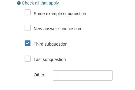 | Description | When using question type "multiple choice" with the general question setting "other", you cannot just select the checkbox for other. The checkbox is only ticked if you enter a text in the text field. The current implementation might lead to a systematic underestimation of the other category. I must be possible to check the checkbox "other" without entering a text. | ||||