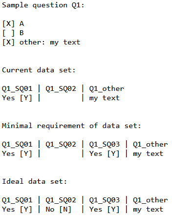 | Description | When using the multiple choice option "other", the value of "other" checkbox is not saved in the data set. For example if question Q1 is answered like this: [X] A The data set will look like this: Q1_SQ01 | Q1_SQ02 | Q1_other However, there is no column for the other option's checkbox, which is needed (or at least very helpful) for analyses and filtering/Expression Manager. The data set must look like this, including a variable (column) for the other option's checkbox: Q1_SQ01 | Q1_SQ02 | Q1_SQ03 | Q1_other Ideally the data set would also show which respondents - who saw the question - did not choose an option. This would make analyses of incomplete data sets (which is the norm) way more easy. Q1_SQ01 | Q1_SQ02 | Q1_SQ03 | Q1_other But that's another ticket, that I'll post in a minute ;-) | ||||