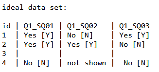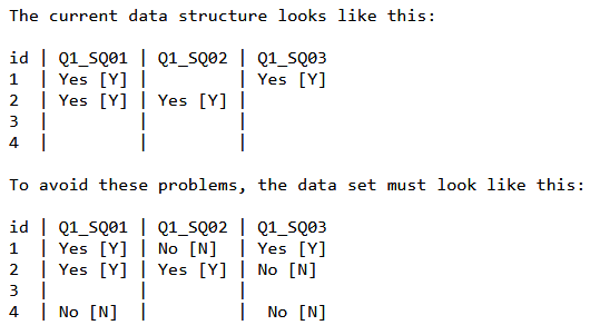 The current data structure looks like this: id | Q1_SQ01 | Q1_SQ02 | Q1_SQ03 So when just looking at the data set, you don't know which respondent saw which subquestion and chose to answer it or not. This really makes analyses and reporting very difficult and can easily result in wrong interpretation of data. Especially id 3 is hard for analyses (keeping real nonresponse and no answer because a subquestion was not shown apart). To avoid these problems, the data set must look like this: id | Q1_SQ01 | Q1_SQ02 | Q1_SQ03 | ||||