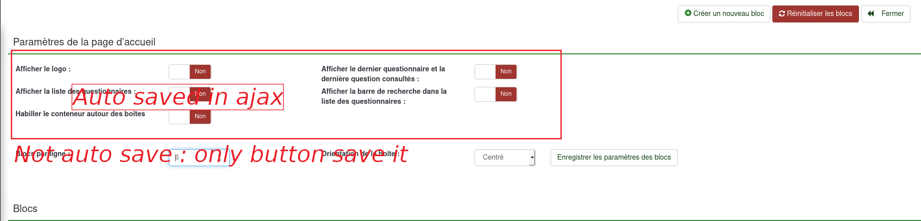 | 2023-01-02 08:42 | DenisChenu | Summary | Two save-buttons in home page settings => uniform ajax vs. non-ajax settings : don't save permanent settings transparently |