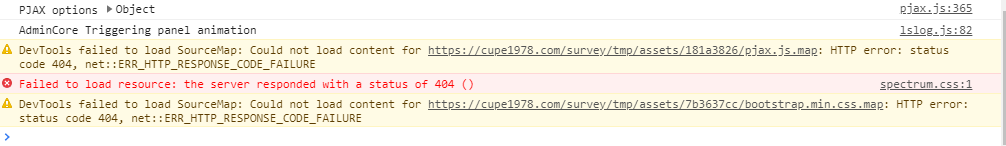 DevTools failed to load SourceMap: Could not load content for https://cupe1978.com/survey/tmp/assets/50538f15/pjax.js.map: HTTP error: status code 404, net::ERR_HTTP_RESPONSE_CODE_FAILURE