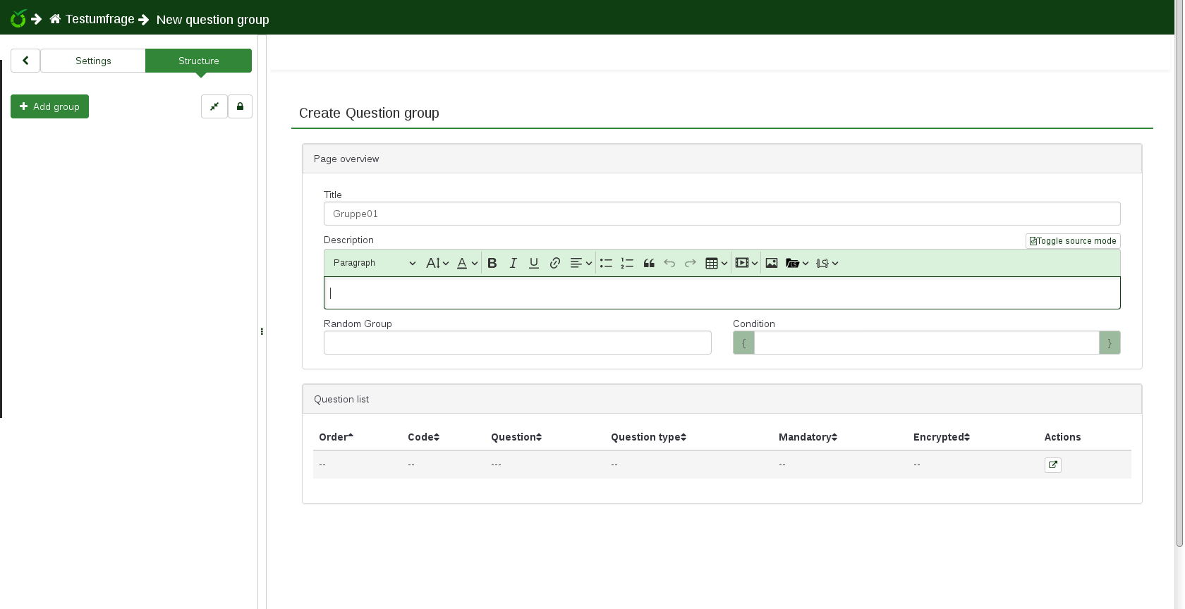 | Description | When setting up a new survey and question group there seems to be no way to save the group. So it's not possible to finish the survey setup. | ||||