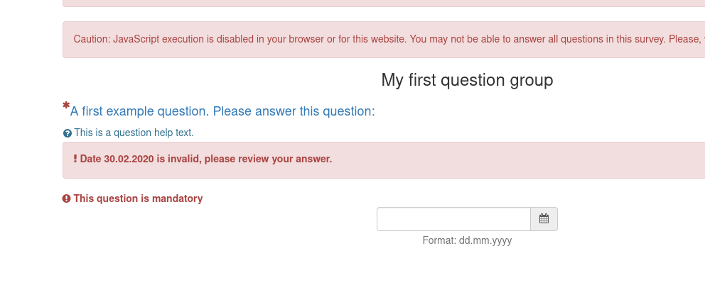 | Steps To Reproduce | Make a survey with base language Finnish, put for example "vvvv-kk-pp" to date format. Add a group and to it a question "Syntymäpäiväsi?" of type "Date/Time". Add English as additional language. Now you can not answer to the question, as the system always says that your response is in wrong format. | ||||