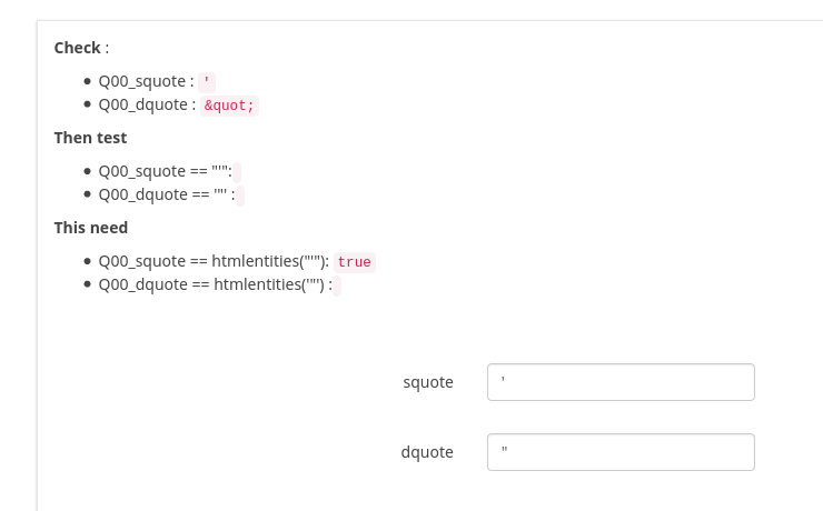 | 2020-05-05 09:49 | DenisChenu | Summary | Simple cote \' in free text or arrays Text => Simple cote \' and ouble quote in free text : difference in PHP and JS and hard to test |