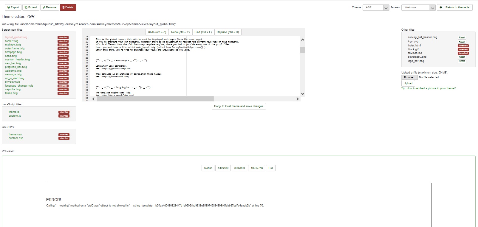 /usr/home/chrislt/public_html/guernseyresearch.com/survey/application/core/Survey_Common_Action.php(274): AdminController->renderPartial("/admin/themeoptions/index", array("oAdminTheme" => AdminTheme, "oQuestionTheme" => QuestionTheme, "oSurveyTheme" => TemplateConfiguration, "canImport" => true, ...), true)