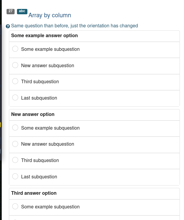 | Description | The question type array by column will be not displayed correctly during survey taken for mobile phones. | ||||