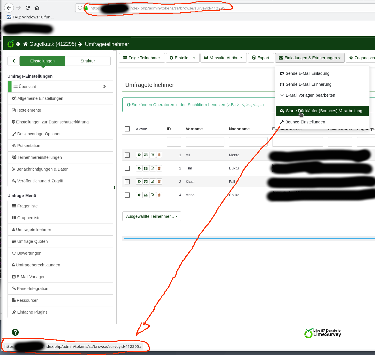 Hi, the URL to show participants of the survey is "/index.php/admin/tokes/sa/browse/surveyid/<number>" . The URL for "bounce settings" is "admin/tokens/sa/bouncesettings/surveyid" ... "bouncesettings"! regards |