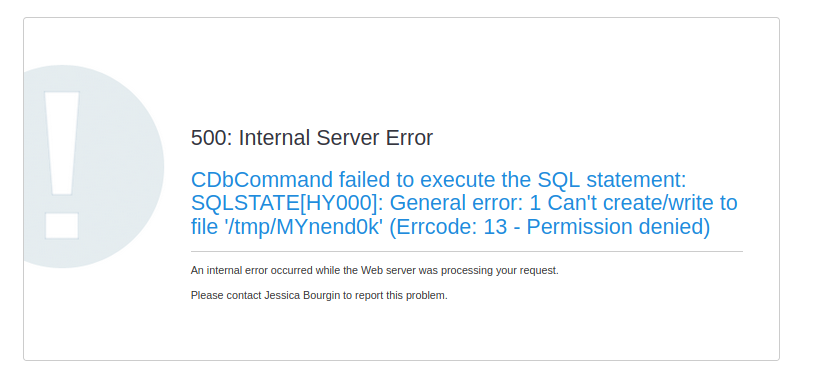 /tmp/ … not a LimeSurvey issue , seems more a SQL issue. SQL user must have some write issue in tmp … And please : activate debug mode |