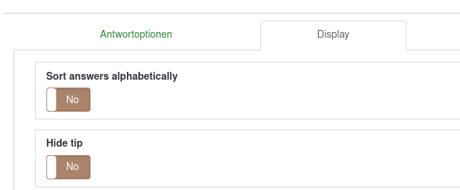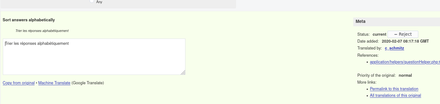 I just checked and "Sort answers alphabetically" seems to be translatable, I checked for Portuguese (Brazil) and it is even translated. Same for "Allow only numerical input...": So I am currently wondering what do you mean with "untranslateable" exactly? That you can't translate it in Glotpress or that the translation will not make it to Limesurvey? Would be great if you could clarify that, because I currently don't understand the issue. |