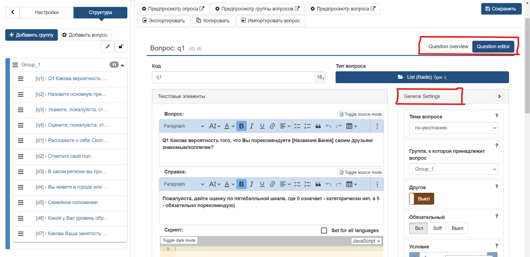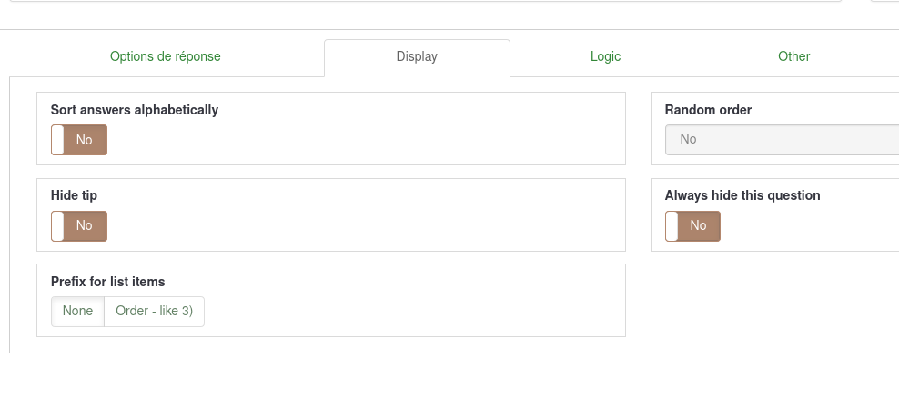 | Description | There are several untranslatable string in LimeSurvey. Maybe the biggest single block is in question editing below every question: those with "Display", "Logic", "Other" etc. All selections in those are not translated, like "Sort answers alphabetically", help text "Allow only numerical input for 'Other' text", option "Nominal" in SPSS export scale etc. | ||||