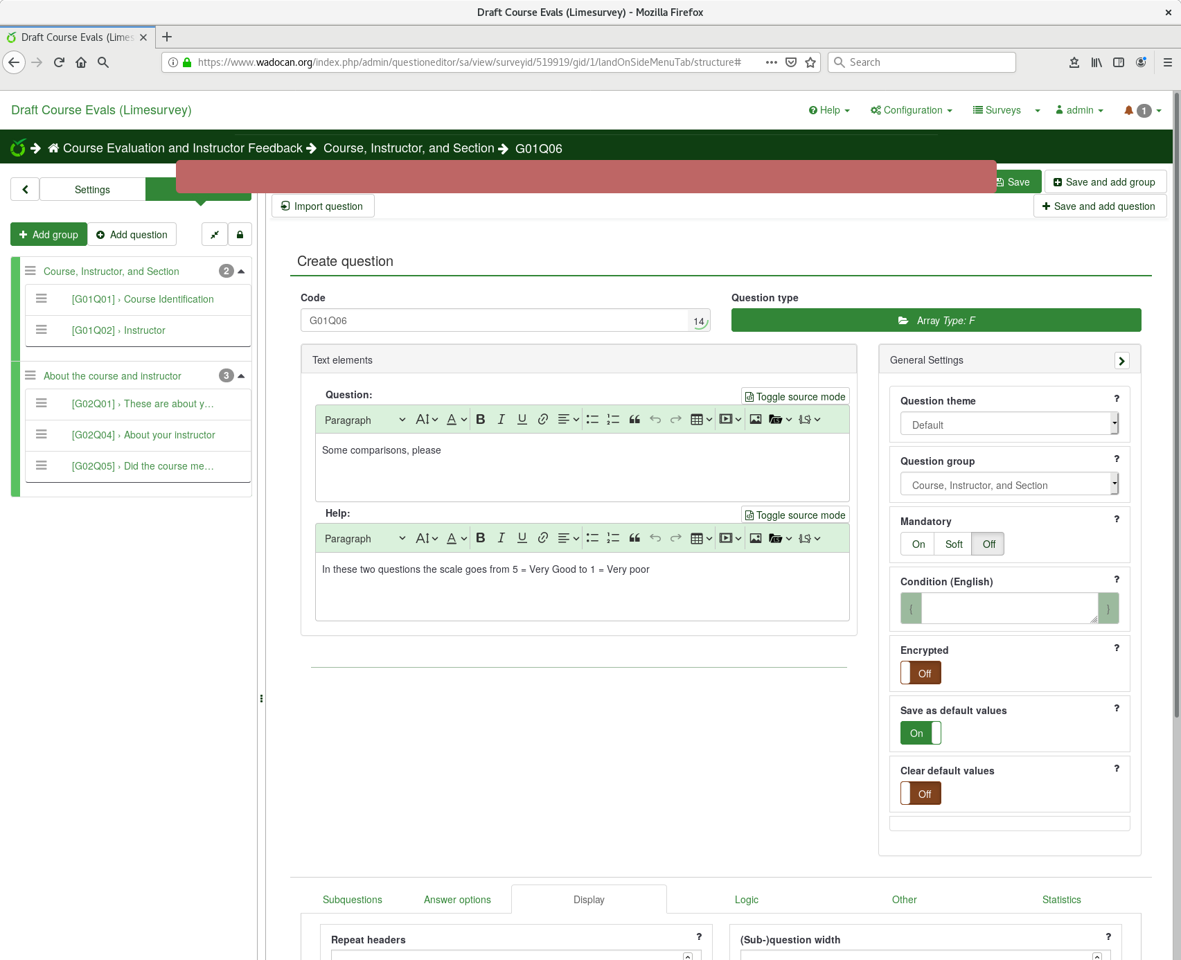 I have no idea why .. but I just created a new survey with some of the same questions that caused the failure yesterday with no problems at all. Nothing has changed except that I added two brackets to the sql.lib.php file for phpmyadmin to correct the error shown above and cleared the browser cache before starting. No permissions were changed anywhere. My default for all of web directories is -R www-data:www-data and that's how it was installed yesterday. I don't see why it would matter but DB perms are GRANT SELECT, INSERT, UPDATE, DELETE, CREATE, DROP, INDEX, ALTER,CREATE TEMPORARY TABLES ON etc etc |