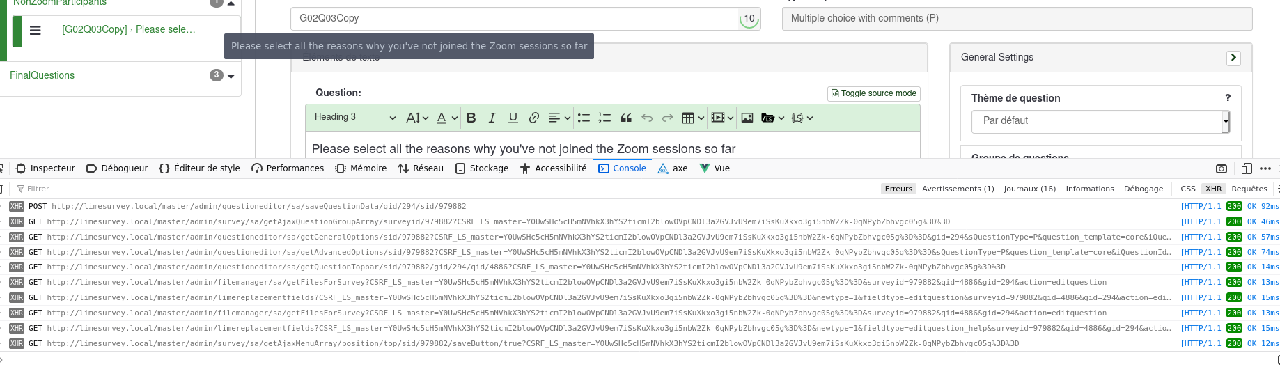 0 - Thanks for the quick responses! Much appreciated. 1 - ah.. I'm being retarded (debile) today .. I'll replicate the error later and hope to see how to start that console then. 2- apache shows some "500" errors from yesterday: e.g. [27/May/2020:14:54:07 -0600] "POST /index.php/admin/questioneditor/sa/saveQuestionData/gid/1/sid/519919 HTTP/1.1" 500 4453 "https://www.wadocan.org/index.php/admin/questioneditor/sa/view/surveyid/519919/gid/1/landOnSideMenuTab/structure" "Mozilla/5.0 (X11; Linux x86_64; rv:68.0) Gecko/20100101 Firefox/68.0" |
