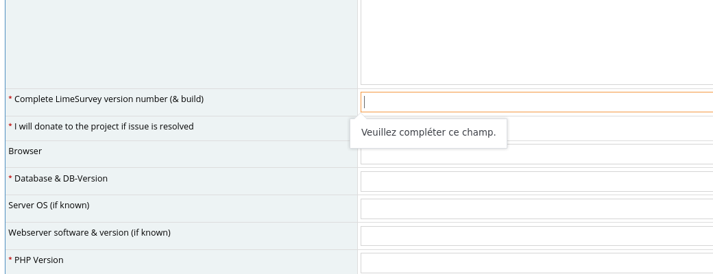 | Description | If I let Complete LimeSurvey version number (& build) be empty, the system asks me to go back to previous page -- but empties all fields then. Slightly irritating. | ||||