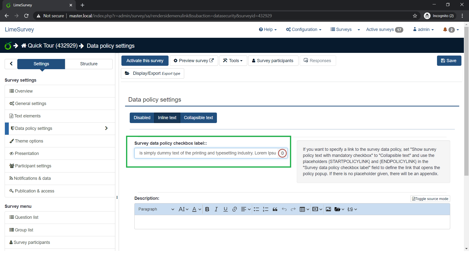 PR: https://github.com/LimeSurvey/LimeSurvey/pull/1453 Added max length and type-counter to data sec label input. |