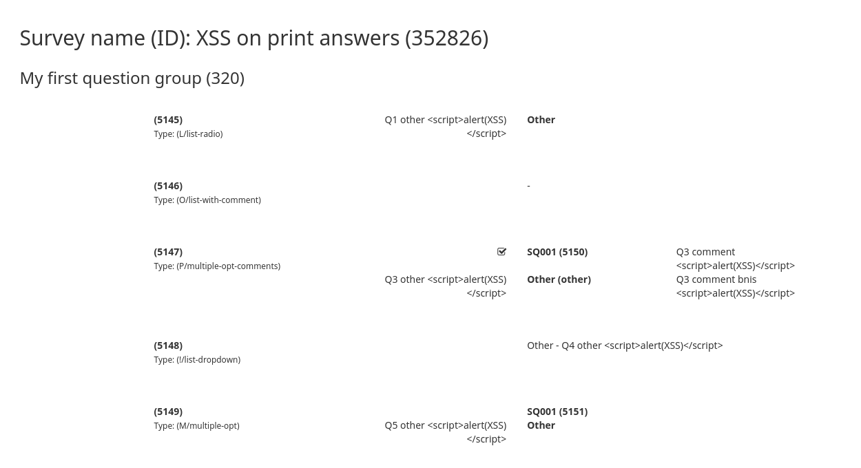 | Additional Information | … … Concept issue : when updating whole printanswers : nothing was done against XSS. If we have a test for this : the test was disabled since it was totally different pages | ||||
