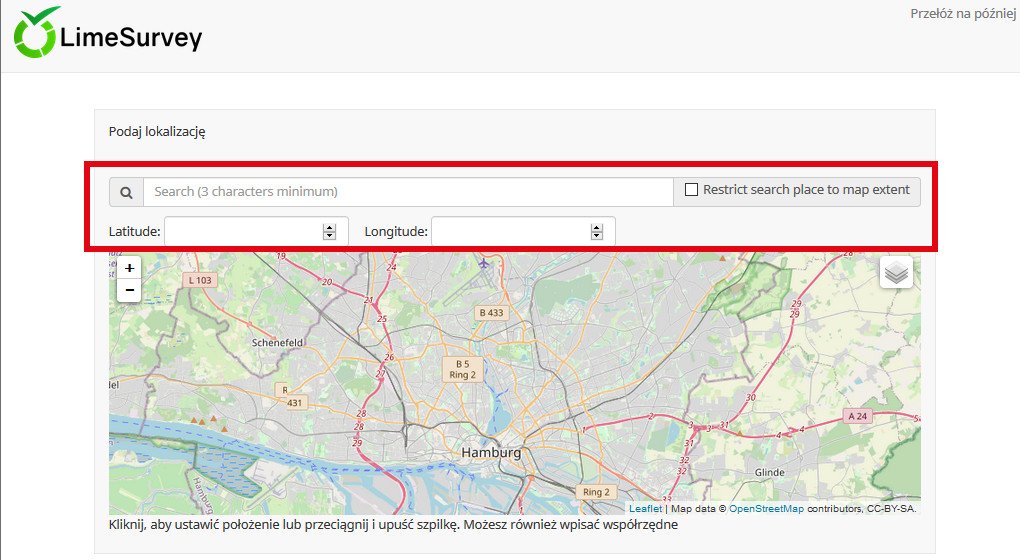 | Description | Short free text with location set to OpenStreetMap via MapQuest. Some elements of the question are not translated in the survey view. See attachment. The survey language is set to Polish. | ||||