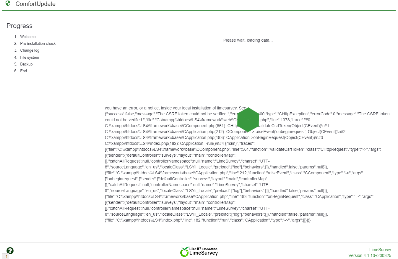 | Description | I just tried to update my shamingly old 4.x installation to the latest for testing purposes. This is a local test environment running on XAMPP. During the update process I received the following error message:Please wait, loading data... you have an error, or a notice, inside your local installation of limesurvey. See : | ||||