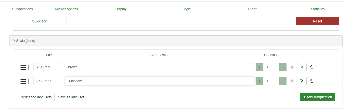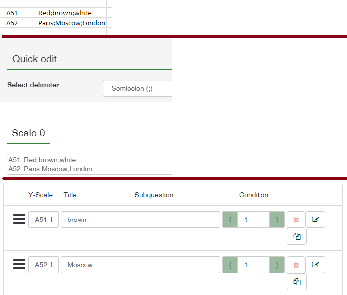 | Steps To Reproduce | Open any array or multiple type question, press Quick add button and try to import this: OR | ||||
