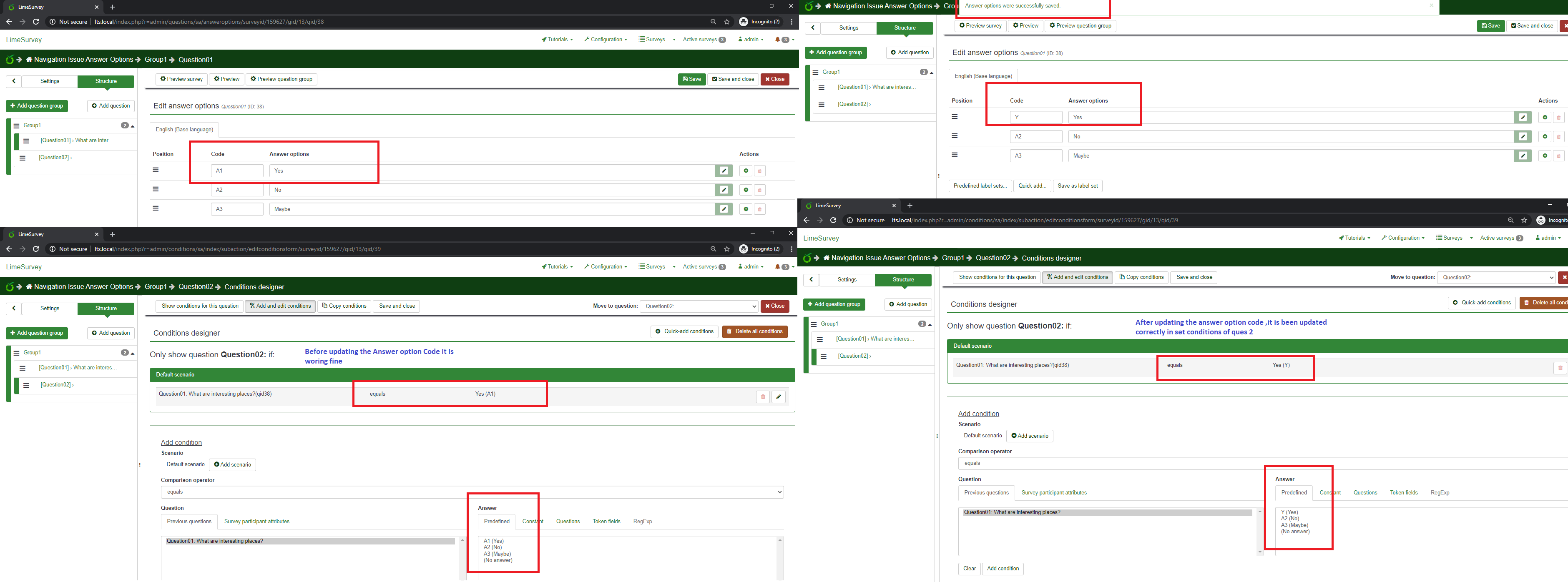 2 - Add the following condition on Q2 3 - Update Q1. Set answer option code for Y to be different. 4 - Condition on Q2 hasn't been updated and it is using the wrong answer option code. | ||||
