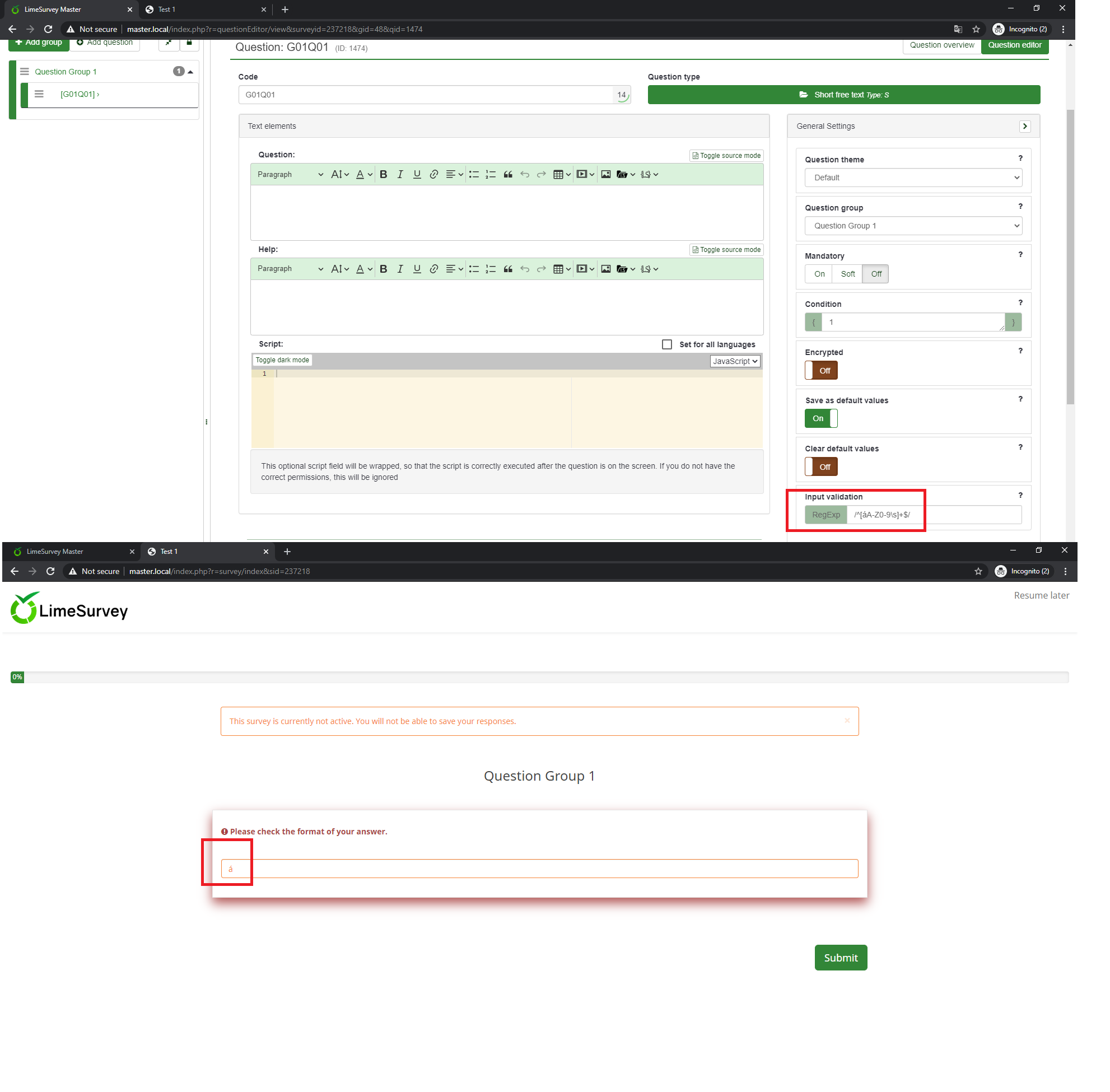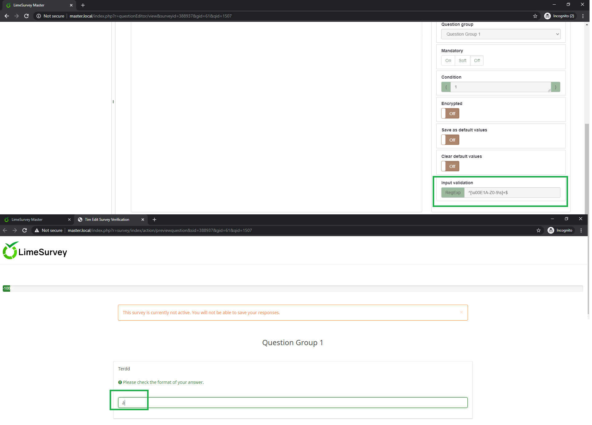 | Steps To Reproduce | Using a test survey, apply this validation regex to any response field and test... | ||||