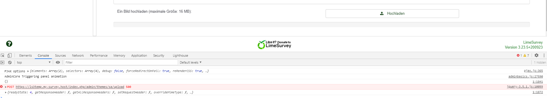 I can reproduce the problem at LS 3.x. Trying to upload a custom PNG file at the survey's theme options fails with a 500 server error, see screenshot. |