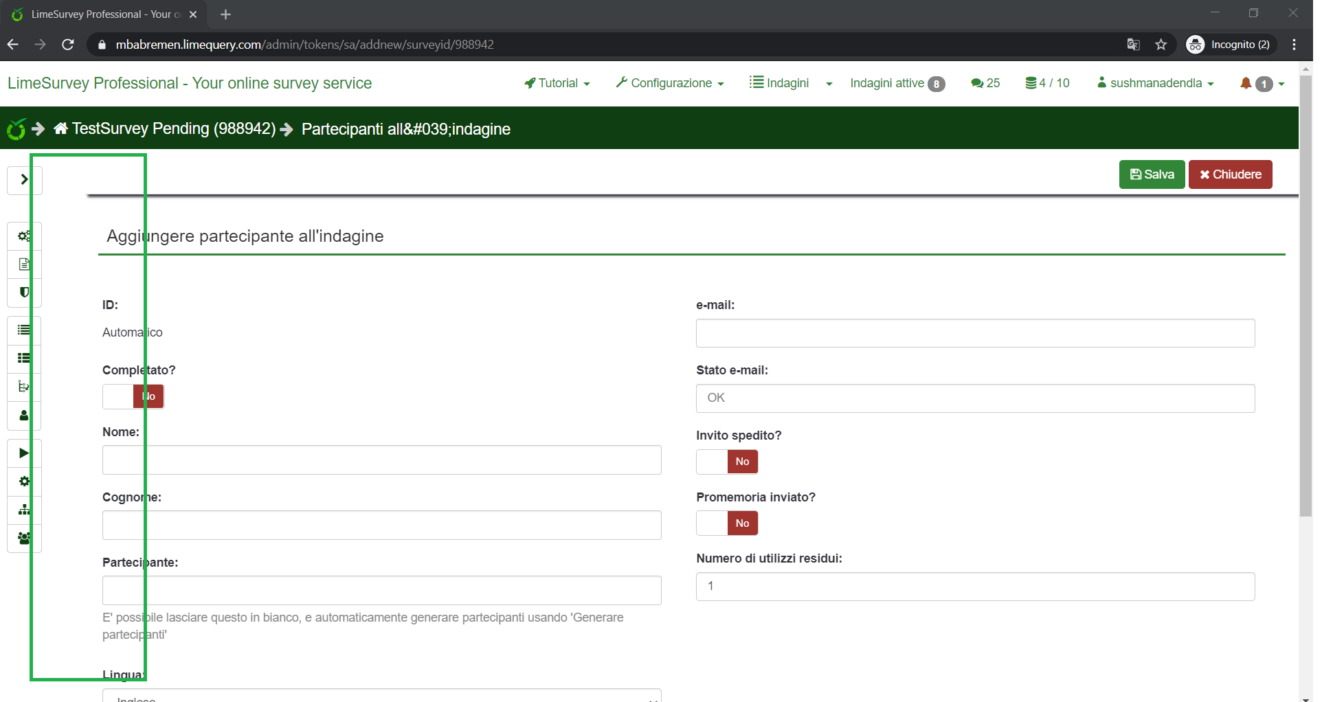 | Steps To Reproduce | Go to https://demo.limesurvey.org/admin and log in with Italian language. in the left "Menù indagine" menu, choose "Partecipanti all'indagine" to open the participant page. The broken "Aggiungere partecipante all'indagine" page is shown. | ||||