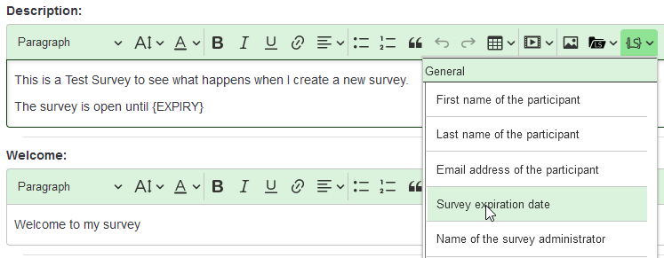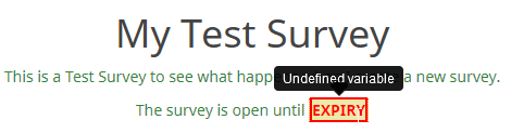 I wanted to show the expiration date which is set for the survey in the description that is shown to the users when starting the survey. In the text editor for the Description field, it is possible to enter the keyword from the menu. The problem is that when starting the survey, the description field does not expand the expiration date, but just shows a red EXPIRY label with a tooltip "Undefined variable": | ||||