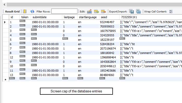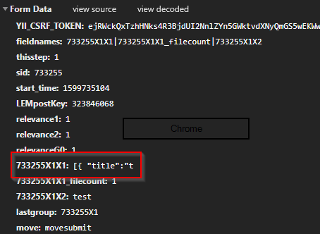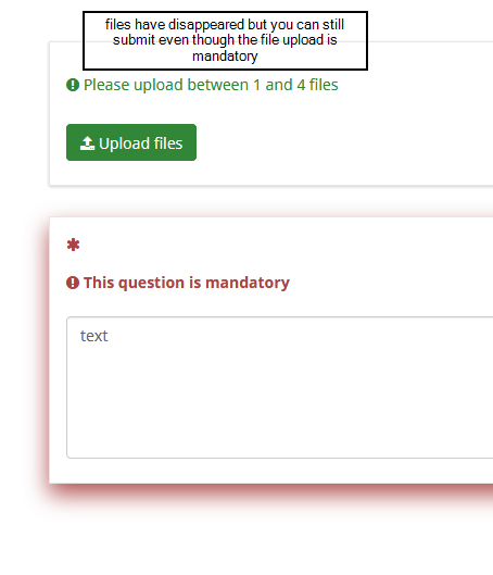 | Steps To Reproduce | import the attached simple LSS file it contains 2 questions a file upload and a mandatory text field the mandatory part is critical to this bug. Activate the survey and browse to it in chrome Version 85.0.4183.102 (Official Build) (64-bit) Add a file in the title field add a gt symbol e.g. t'itle Do not enter any text into the mandatory text question Click submit. An error occurs close the error dialogue Now you can see that the upload question contains damaged JSON open the developer screen in chrome (F12) add text to the mandatory text field Submit the form and see what is actually submitted This also fails in firefox however the symptoms can be a bit different (at times) | ||||