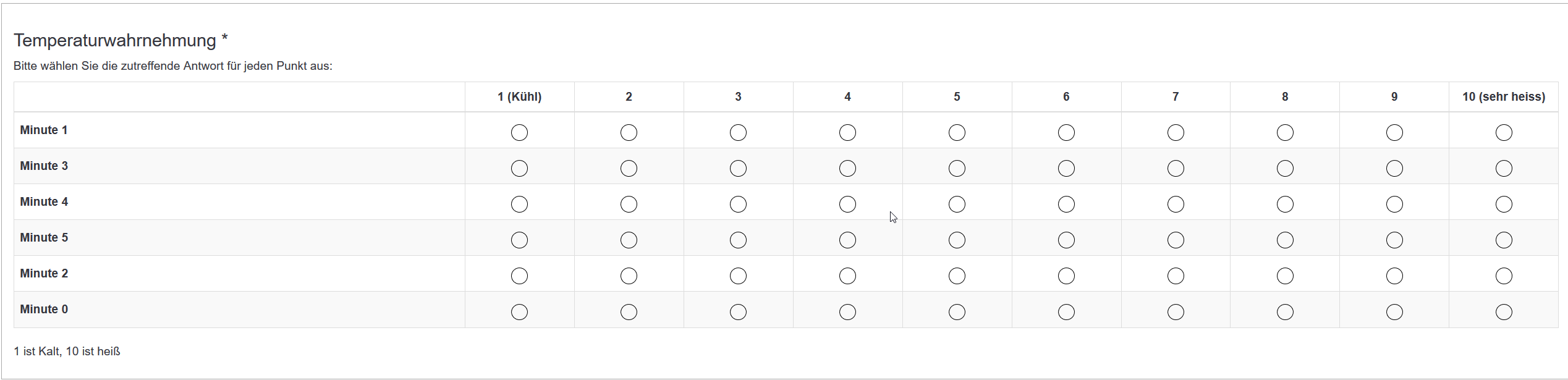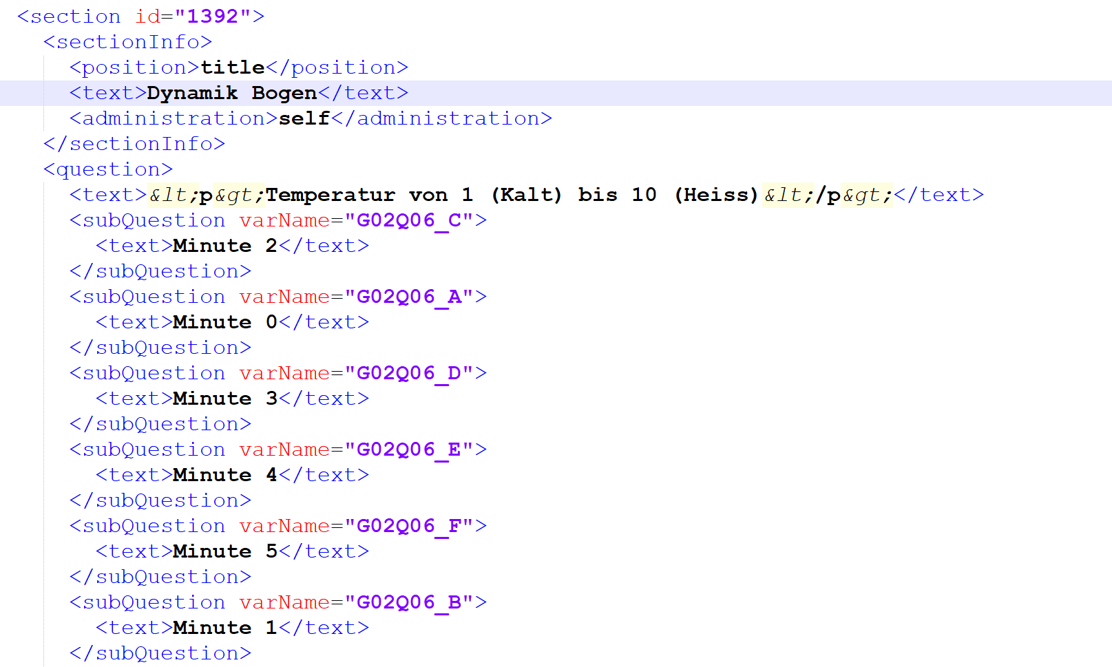 | Description | Hello, I made and remade the same array (6 Questions, 10 values from 1-10) in multiple (also new) survey and with import, with creating it new, multiple times. In LimeSurvey I see it ordered Minute 0-5. In the Database I see the QID to be sequencial (say 2013, 2014 and so on, the question ordering in the DB is also 1-6. So from Limesurvey side everything looks great. As soon as I go to export and either select html or (what I would want) quexf pdf the array gets more or less random. 2,0,3,4,5,1 So I have no idea how and why the export treats the sorting without looking at either the sorting order (which again is there in the database and in LS as it shows correctly in the online survey). | ||||