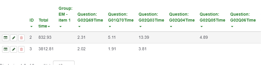 "Response ID","Date submitted","Last page","Start language","Seed","question 1 [answer1]","question 1 [answer2]","question 2 [answer 1]","question 2 [answer 2]","Total time","Group time: test1","Question time: G01Q01","Question time: G01Q02" "1","1980-01-01 00:00:00","2","en","249824510","3","4","3","2","","","","" "2","1980-01-01 00:00:00","2","en","265555350","3","3","3","3","","","","" |