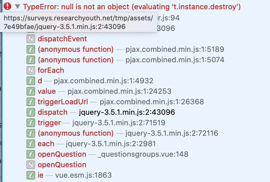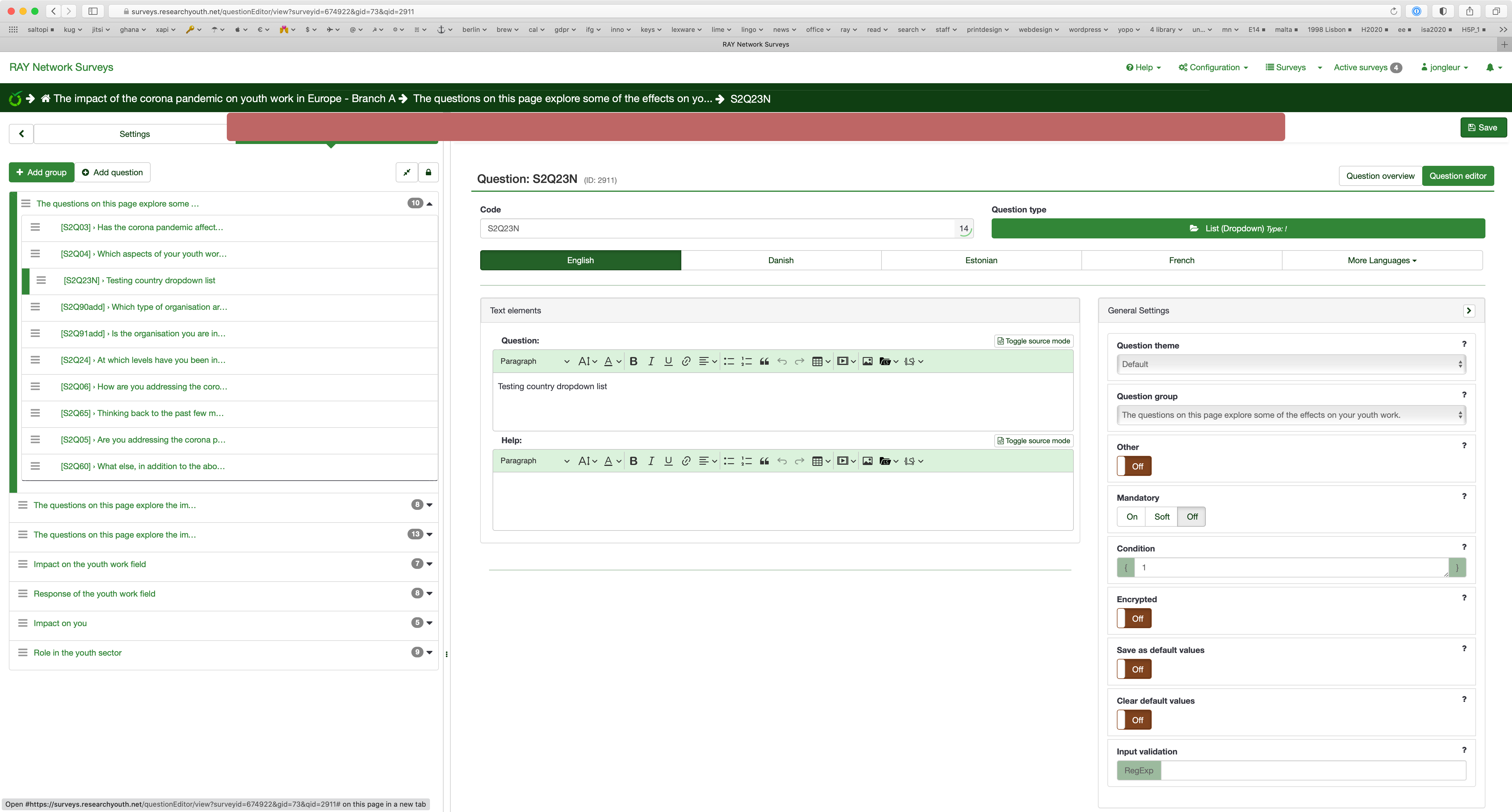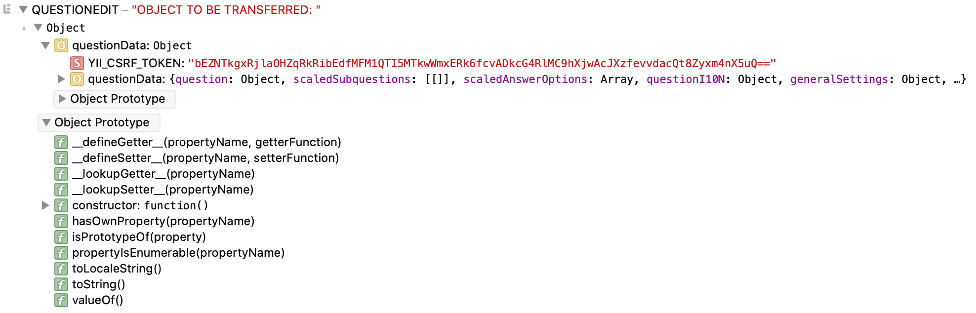 | Description | Since updating from 4.12 straight up to 4.17, our long-running 4.x installation has become funky. Randomly, to our minds at the moment at least, changes to questions do not get saved. This happens consistently to all dropdown questions with a red bar appearing at the top at the attempt to save the question, which contains no text at all. It also happens inconsistently to most other question types when adding or changing translations, though the question gets saved and the saving is confirmed, with the caveat that the changes do not get saved. Console errors include:
