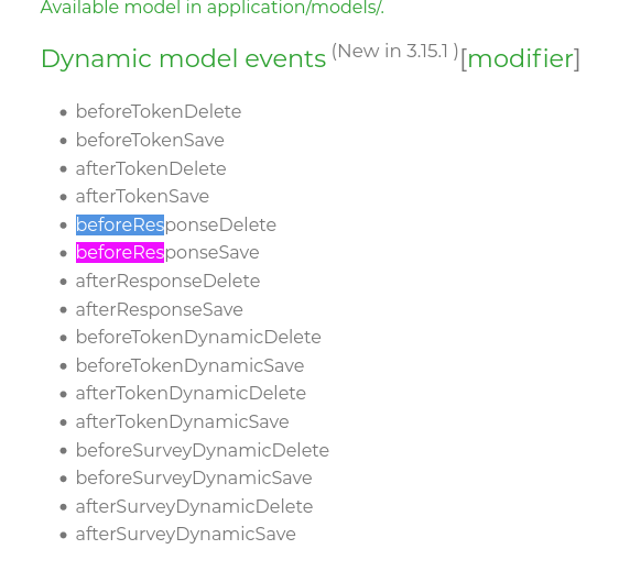 Yes : because its a dynamic name event : You know the file : https://github.com/LimeSurvey/LimeSurvey/commit/703da1daee34e22aa43e4eae96f10a56b0a7ebb8#diff-4b12d5298d112354d26385cdd1b735fd But before moving EM to PDO and use ->save : the event didn't happen for public part (and response). And beofre 3.15 : beforeResponse_1234Save are not very clear … |