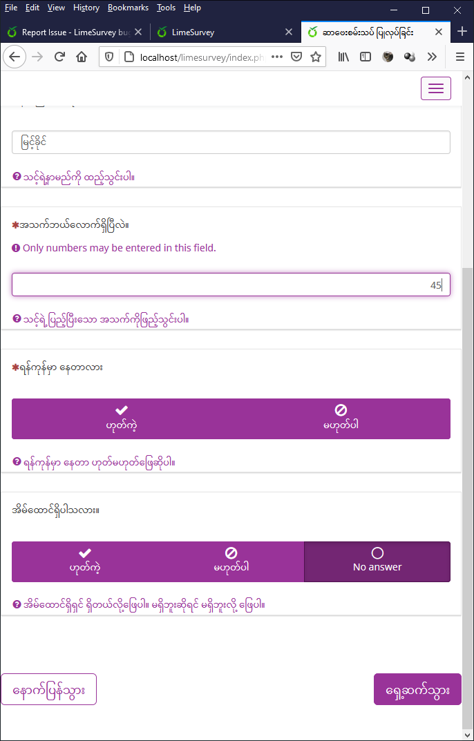 msgid "" msgstr "" "PO-Revision-Date: 2020-10-06 20:52+0630\n" "MIME-Version: 1.0\n" "Content-Type: text/plain; charset=UTF-8\n" "Content-Transfer-Encoding: 8bit\n" "Plural-Forms: nplurals=2; plural=n != 1;\n" "X-Generator: Poedit 2.4.1\n" "Language: my_MM\n" "Project-Id-Version: LimeSurvey 3.x.x\n" "POT-Creation-Date: \n" "Last-Translator: Yar Zar Ye Ni <yarzaryeni@gmail.com>\n" "Language-Team: \n" msgid "" "After having clicked the save button you can either close this browser window or continue filling out " "the survey." msgstr "သိမ်းဆည်းရန် ခလုတ်အားနှိပ်ပြီးလျှင် ဤစာမျက်နှာအားပိတ်နိုင်ပါသည် သို့မဟုတ် စစ်တမ်းကောက်ယူခြင်းအား ဆက်လက်ဖြေဆိုနိုင်ပါသည်။" msgid "Answer must be %s" msgstr "အဖြေသည် ( %s ) ဖြစ်ရမည်" msgid "Answer was" msgstr "သင်ဖြေဆိုခဲ့သော အဖြေမှာ" msgid "Answers cleared" msgstr "အဖြေများအား ရှင်းလင်းပြီးပါပြီ" msgid "Cancel" msgstr "ပယ်ဖျက်မည်" msgid "Choose one of the following answers" msgstr "အောက်ပါ အဖြေများမှ တစ်ခုအား ရွေချယ်ပါ" msgid "Close" msgstr "ပိတ်မည်" msgid "Continue" msgstr "ဆက်သွားမည်" msgid "Did Not Save" msgstr "မသိမ်းဆည်းခဲ့ပါ" msgid "" "Either you have been inactive for too long, you have cookies disabled for your browser, or there were " "problems with your connection." msgstr "" "သင် အချိန်ကြာမြင့်စွာ ဘာမှမလုပ်ဘဲ နေသဖြင့် သို့မဟုတ် သင်၏ ဘရောင်ဇာတွင် Cookie အသုံးပြုခြင်းကို ပိတ်ပင်ထားသဖြင့် သို့မဟုတ် သင်၏ အင်တာနက် " "လိုင်းကျနေသောကြောင့် ဖြစ်နိုင်ပါသည်။" msgid "English" msgstr "အင်္ဂလိပ်" msgid "Enter a name and password for this survey and click save below." msgstr "ဤစစ်တမ်းကောက်ယူခြင်း အတွက် အမည်နှင့် စကားဝှက်ဖြည့်သွင်း၍ အောက်ပါ သိမ်းဆည်းရန် ခလုတ်အား နှိပ်ပါ။" msgid "Error" msgstr "မှားယွင်းနေသည်" msgid "Exit and clear survey" msgstr "စစ်တမ်းကောက်ယူခြင်းအား ရှင်းလင်းပြီး ထွက်မည်" msgid "Female" msgstr "မ" msgid "Gender" msgstr "လိင်" msgid "If you give an email address, an email containing the details will be sent to you." msgstr "အီးမေးလ်လိပ်စာ ပေးမည်ဆိုလျှင် အသေးစိတ်အချက်အလက်များအား သင့်ဆီကို အီးမေးလ်ဖြင့်ပေးပို့ပါမည်။" msgid "Language" msgstr "ဘာသာစကား" msgid "Language:" msgstr "ဘာသာစကား -" msgid "Load now" msgstr "ယခုခေါ်ယူမည်" msgid "Load unfinished survey" msgstr "မပြီးဆုံးသေးသည့် စစ်တမ်းကောက်ယူခြင်းအား ပြန်လည်ခေါ်ယူမည်" msgid "Male" msgstr "ကျား" msgid "Name" msgstr "အမည်" msgid "Name [ID]" msgstr "အမည် [ID]" msgid "Name:" msgstr "အမည် -" msgid "Next" msgstr "ရှေ့ဆက်သွား" msgid "No" msgstr "မဟုတ်ပါ" msgid "OK" msgstr "အိုကေ" msgid "Ok" msgstr "အိုကေ" msgid "" "One or more mandatory questions have not been answered. You cannot proceed until these have been " "completed." msgstr "တစ်ခု သို့မဟုတ် တစ်ခုထက်ပိုသော မဖြစ်မနေဖြေဆိုရမည့် မေးခွန်းအား မဖြေဆိုရသေးပါ။ ၎င်းတို့ကို မဖြေဆိုဘဲ ရှေ့ဆက်၍ မရနိုင်ပါ။" msgid "" "One or more questions have not been answered in a valid manner. You cannot proceed until these " "answers are valid." msgstr "တစ်ခု သို့မဟုတ် တစ်ခုထက်ပိုသော မေးခွန်းများကို ဘောင်ဝင်အောင် ဖြေဆိုမထားပါ။ ၎င်းတို့အား ဘောင်ဝင်အောင် မဖြေဆိုဘဲ ရှေ့ဆက်၍ မရနိုင်ပါ။" msgid "Only answer this if the following conditions are met:" msgstr "အောက်ပါ အခြေအနေများနှင့် ကိုက်ညီနေမှသာလျှင် မေးခွန်းအား ဖြေဆိုပါ။" msgid "Password:" msgstr "စကားဝှက် -" msgid "Please choose *only one* of the following:" msgstr "အောက်ပါတို့မှ *တစ်ခုတည်းကိုသာ* ရွေးချယ်ပါ။" msgid "Please confirm you want to clear your response?" msgstr "သင်၏ဖြေဆိုမှုအား ရှင်းလင်းရန် အတည်ပြုပါ။" msgid "Please contact %s ( %s ) for further assistance." msgstr "အကူအညီများ ထပ်မံရယူနိုင်ရန် %s (%s) အား ဆက်သွယ်ပါ။" msgid "Please write your answer here:" msgstr "သင်၏အဖြေအား ဤနေရာတွင် ရေးသားပါ -" msgid "Previous" ms
