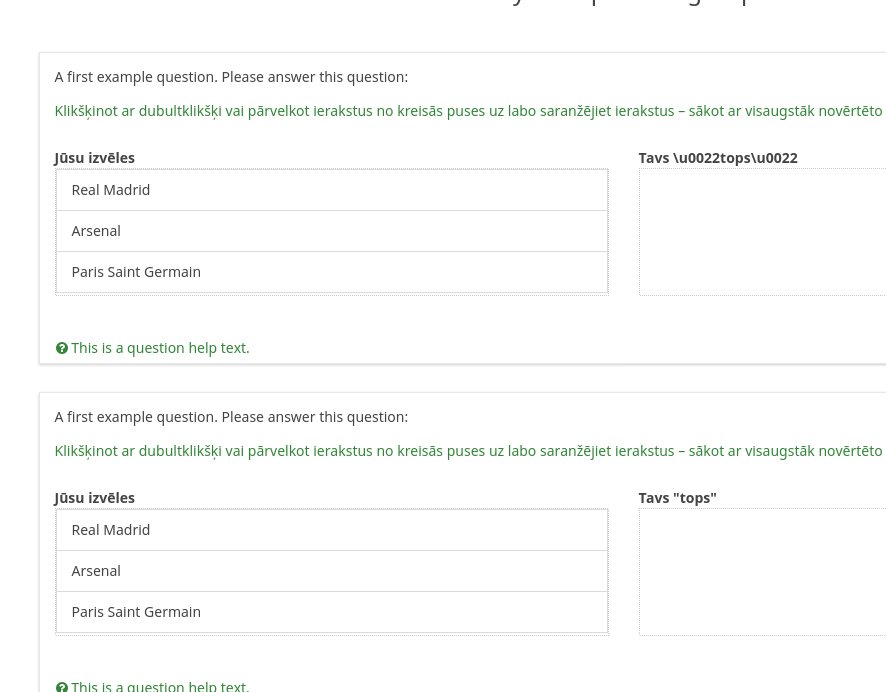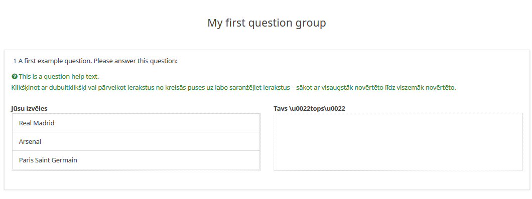 | Description | Title for ranking question gets codes instead of quotes, at least in Latvian translation. This is shown as in the enclosed picture. This happens in our 3.x-LTS version as well as in the official demo version (LS 4). | ||||